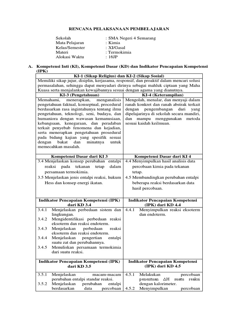 RENCANA PELAKSANAN PEMBELAJARAN Satuan Pendidikan : SMA / MA Kelas/Semester : XI/Genap Alokasi Waktu : 2 x 45 menit KD : 3.4 d