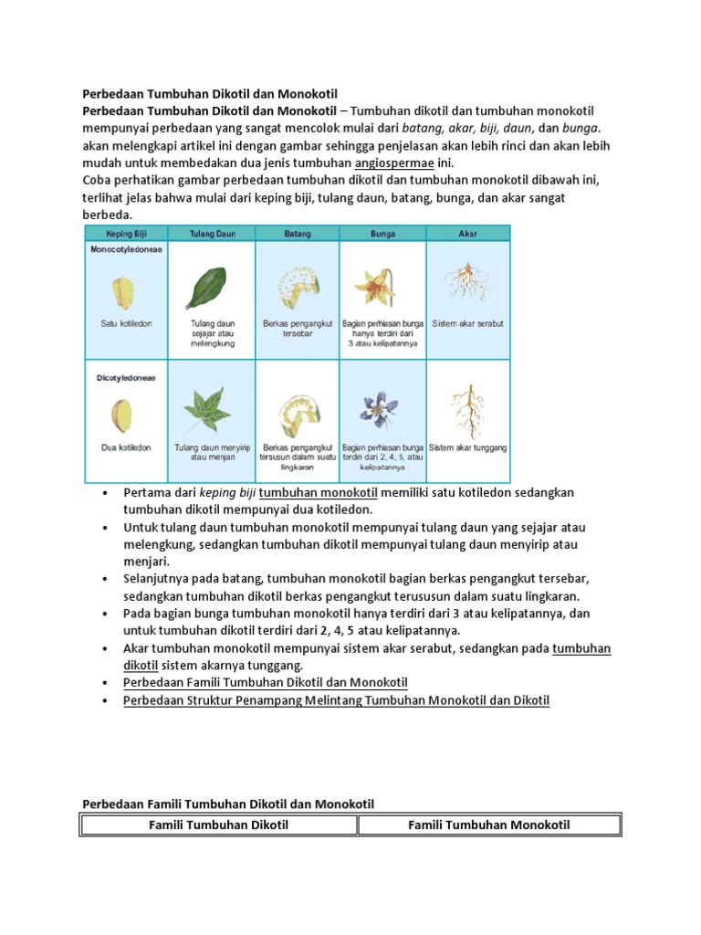 jelaskan perbedaan antara tumbuhan dikotil dan monokotil! Buatlah dalam bentuk tabel! - Brainly.co.id