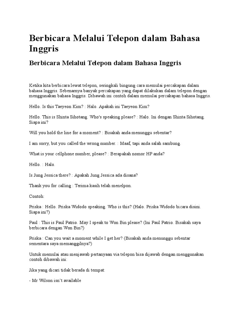 Percakapan Telepon Dalam Bahasa Inggris Dan Terjemahannya …