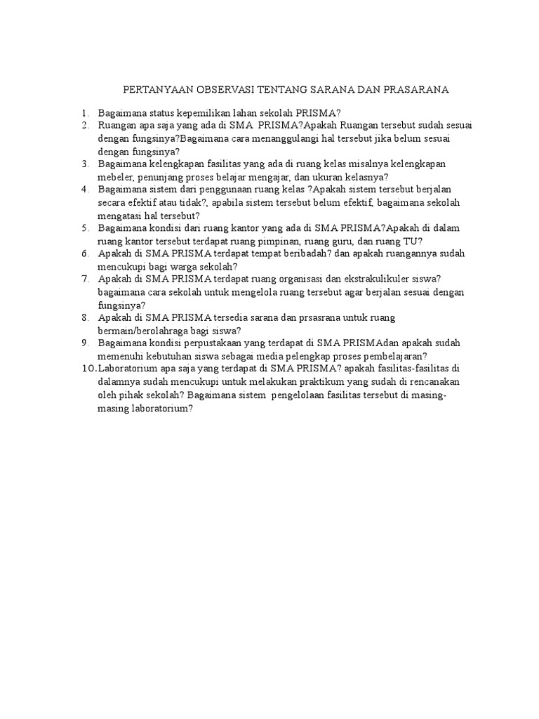 Pertanyaan Observasi Tentang Sarana Dan Prasarana (1)