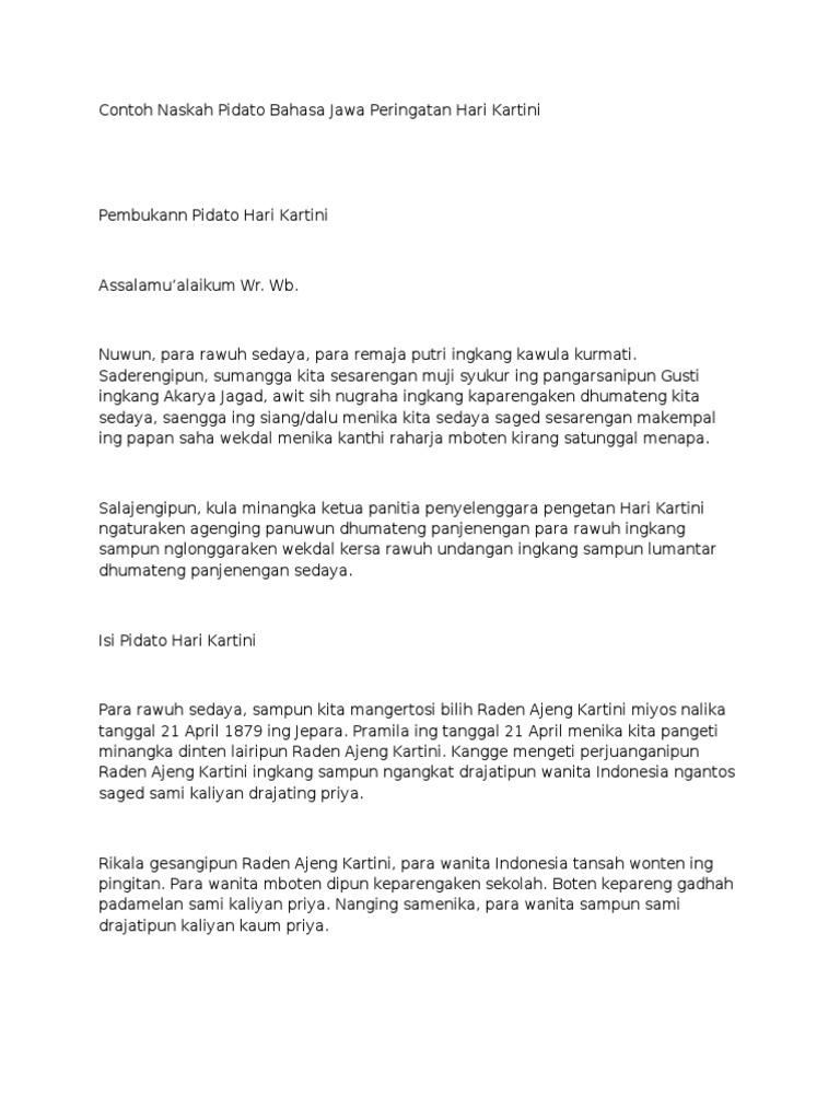 PIDATO BAHASA JAWA HARI KARTINI.docx - PIDATO BAHASA JAWA HARI KARTINI CONTOH 1 Assalamu\u2019alaikum Wr Wb Poro rawu sedoyo ingkang kulo hormati Ing dalem | Course Hero