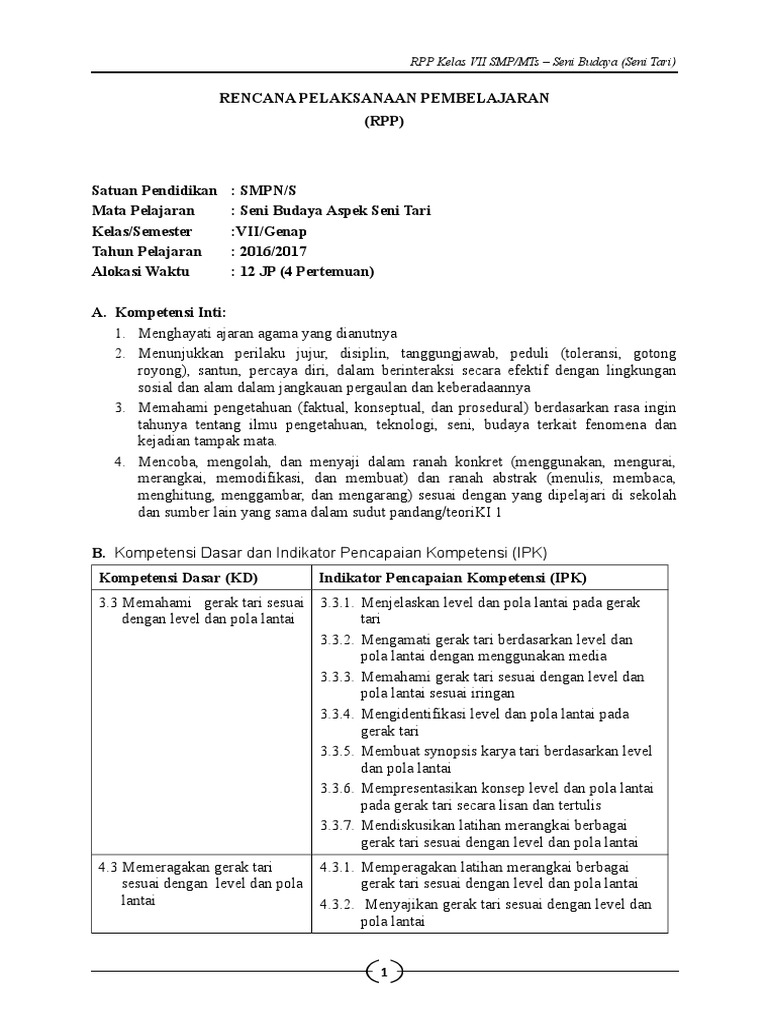 PERANGKAT PEMBELAJARAN MATA PELAJARAN SENI BUDAYA / SENI TARI SMP NEGERI 1 KLATEN SEMESTER 1