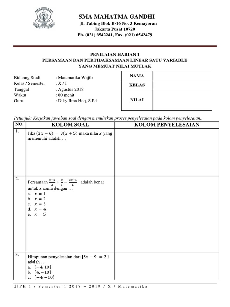 YAYASAN TUHAN ITU ESA - ? Web viewMatematika. Materi Pokok: Persamaan Dan Pertidaksamaan Nilai Mutlak - [DOCX Document]
