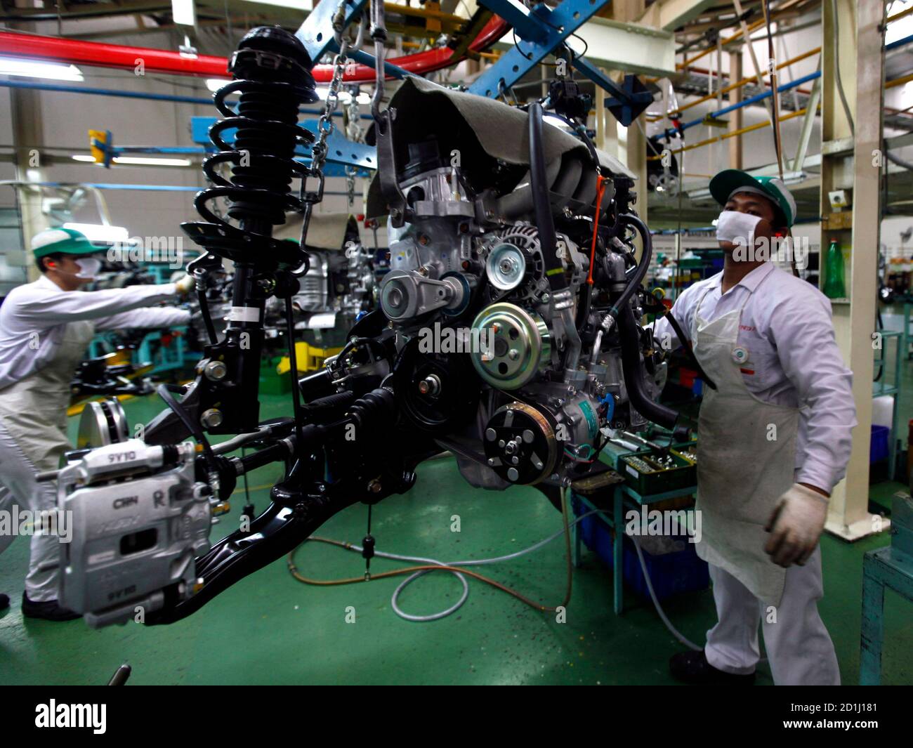Indonesian workers inspect a new multi-purpose vehicle called …