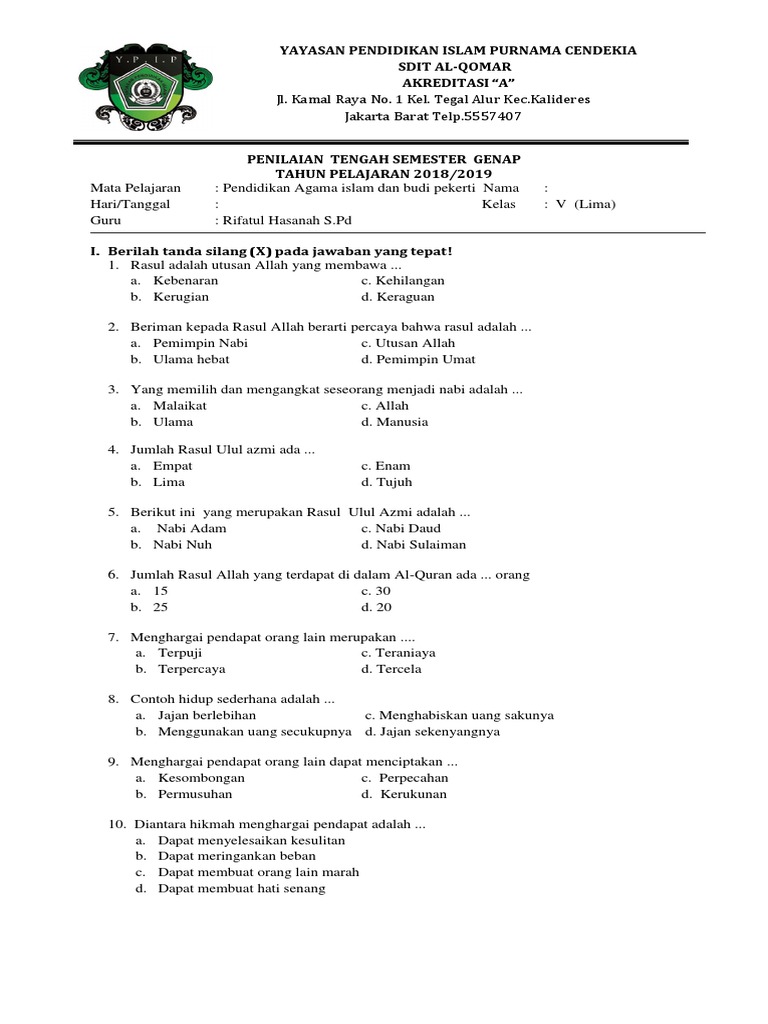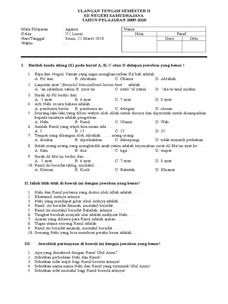 Soal Ulangan Harian PAI Kelas 5 Semester 2 K-13 - SekolahDasar.Net