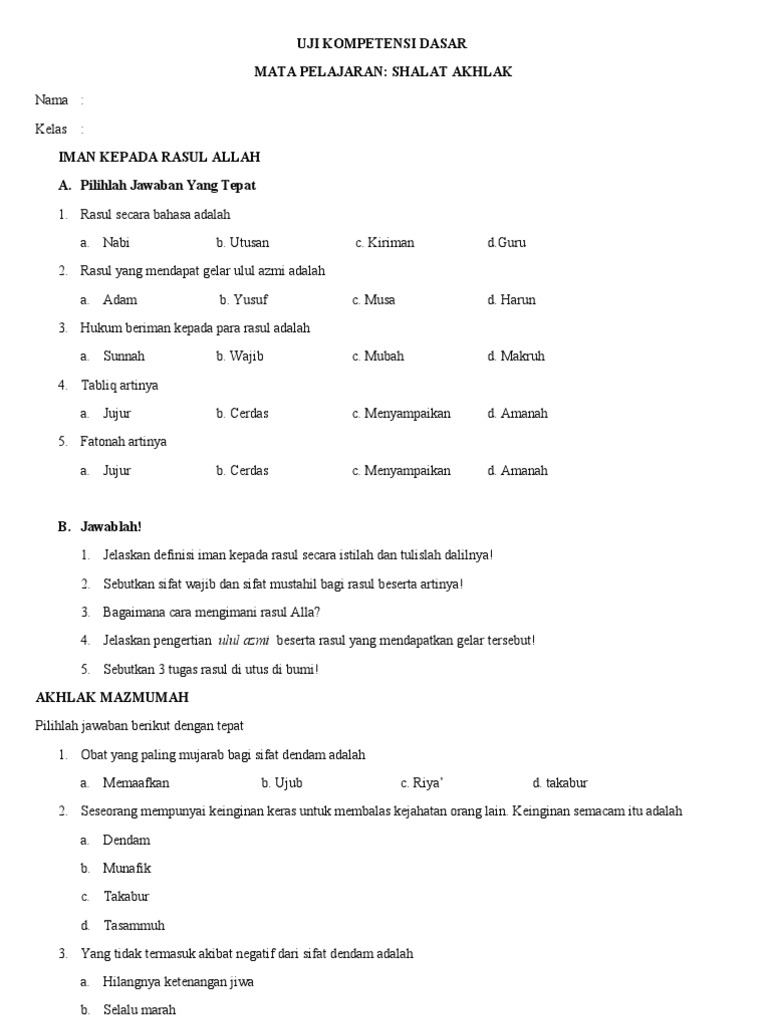 Uji Kompetensi Dasar Mata Pelajaran: Shalat Akhlak