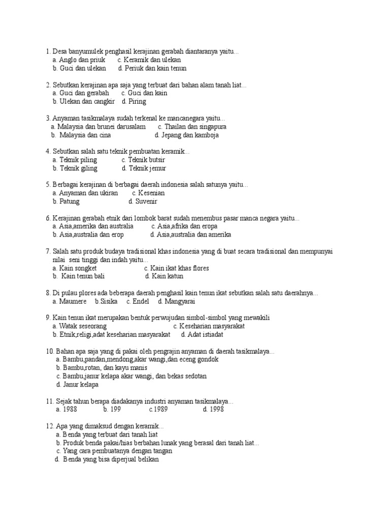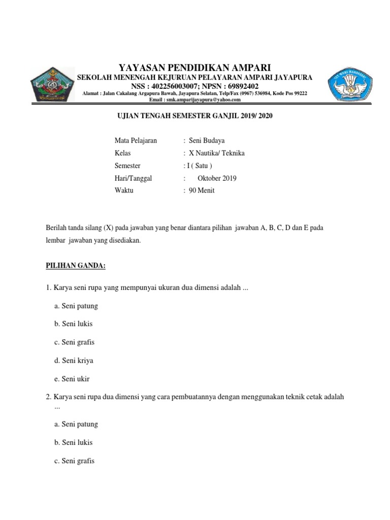 Contoh Soal Seni Budaya Kelas 10 (X) SMA/MA/SMK Semest