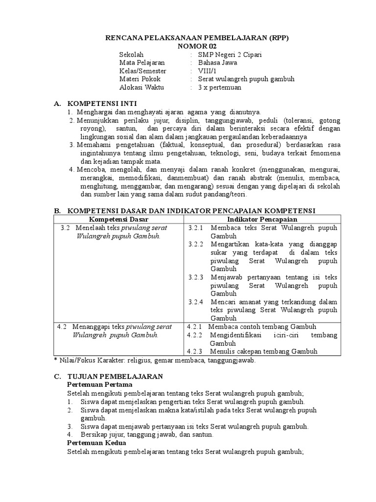 RPP 2 Serat Wulangreh Pupuh Gambuh Kelas VIII Semester 1 Bagian 1 …