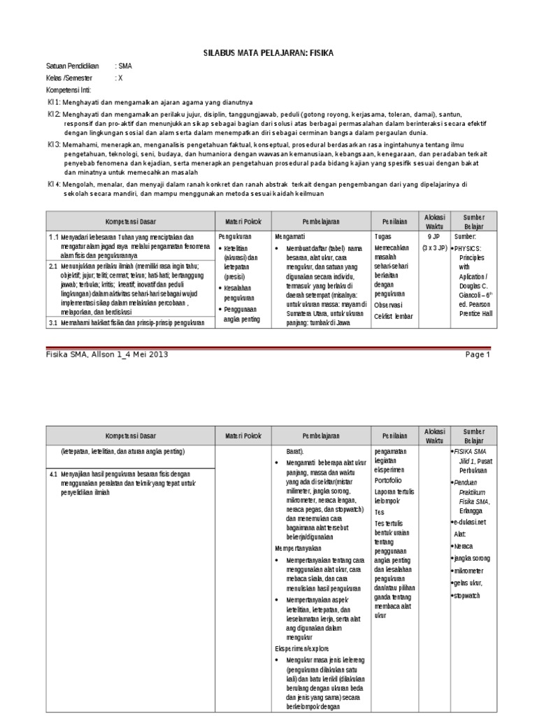 Silabus Fisika Sma Kelas x Kurikulum 2013