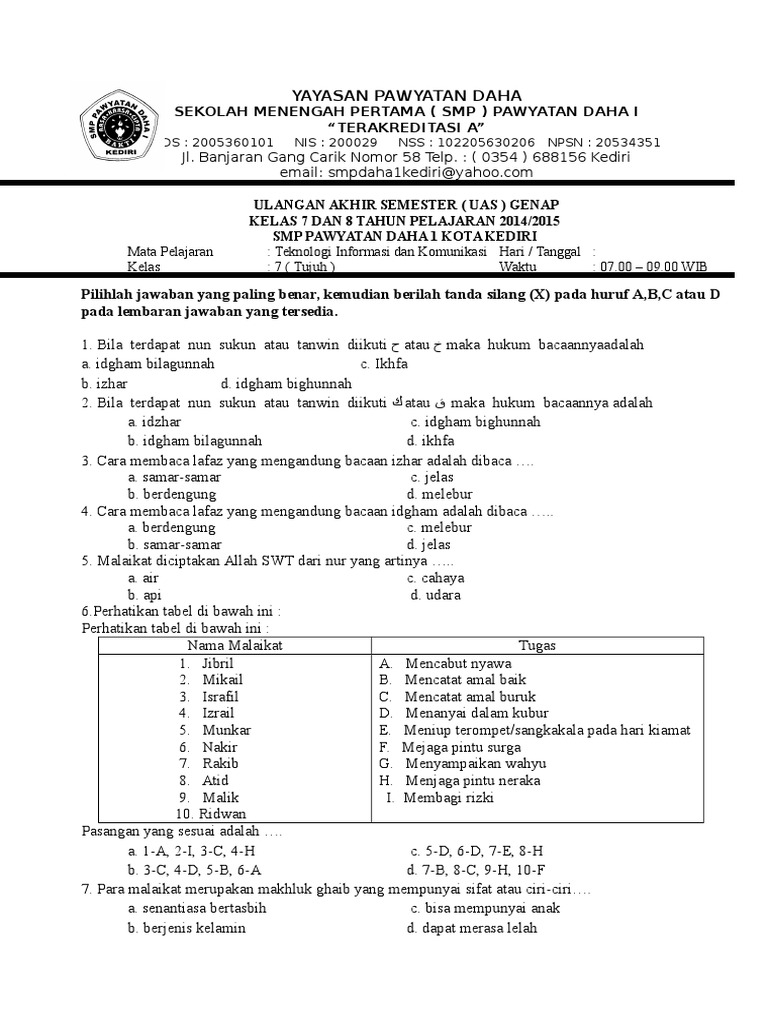 Soal Uas Pai Kelas 7 Semester 1 Kurikulum 2013