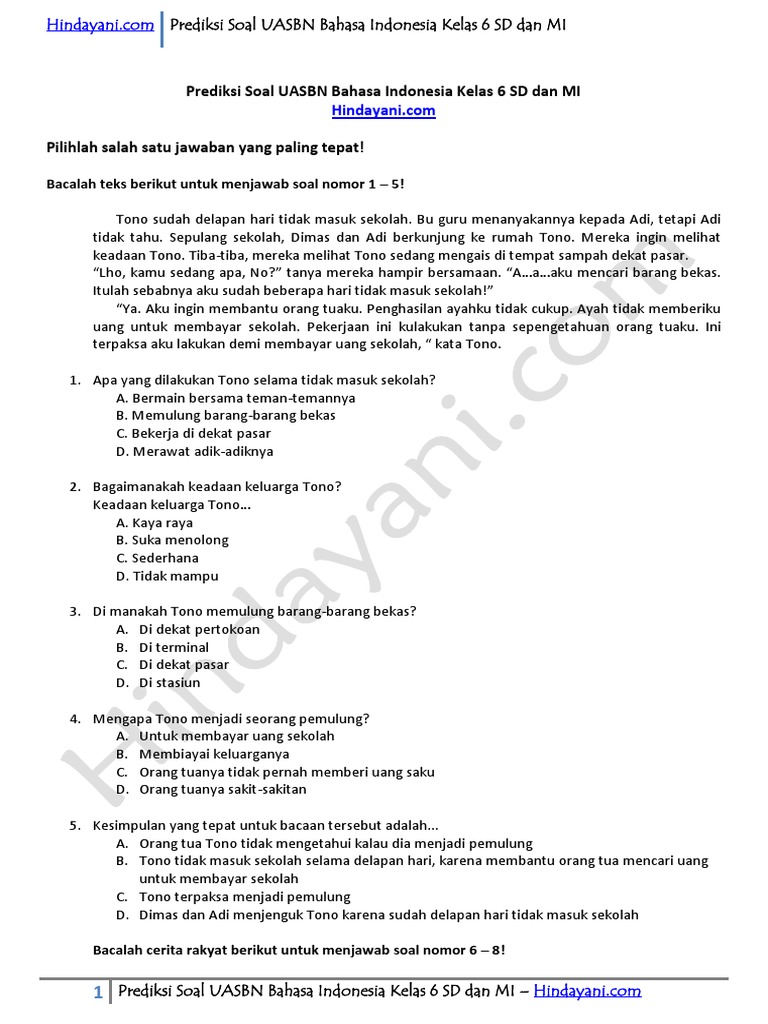 Prediksi Soal UASBN Bahasa Indonesia Kelas 6 SD Dan MI