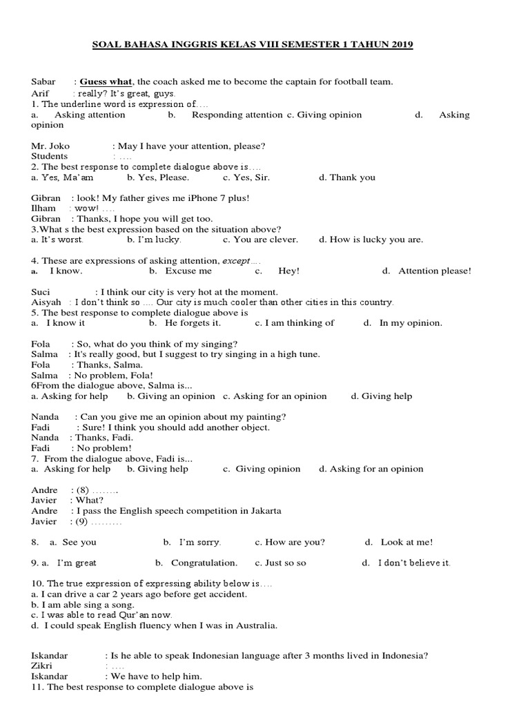 Soal Bahasa Inggris Kelas Viii Semester 1 Tahun 2019