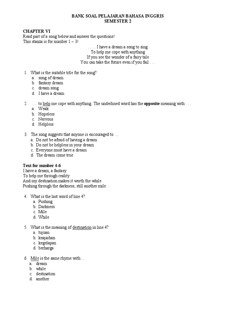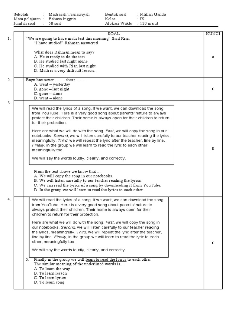 Contoh Soal Bahasa Inggris Tentang Song Beserta Jawabannya Pilihan …