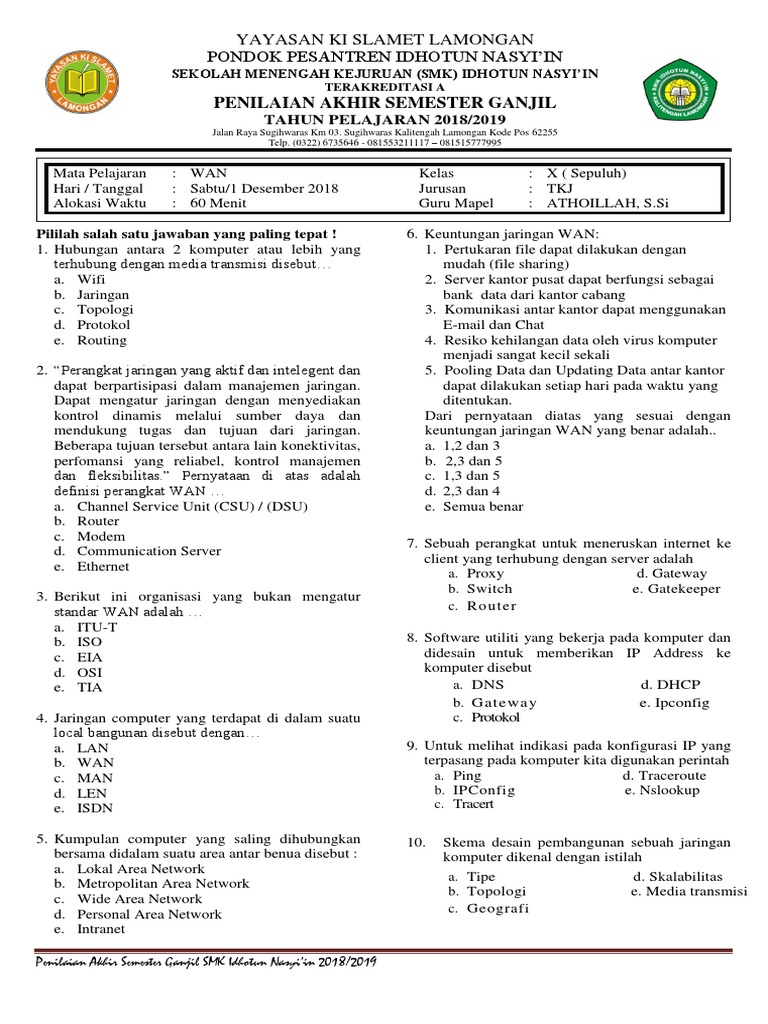 Soal Jaringan Dasar SMK Kelas X TKJ