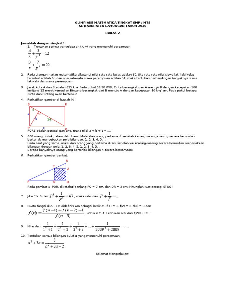 Soal Olimpiade Matematika SMP-MTs Kab. Lamongan Tahun 2010