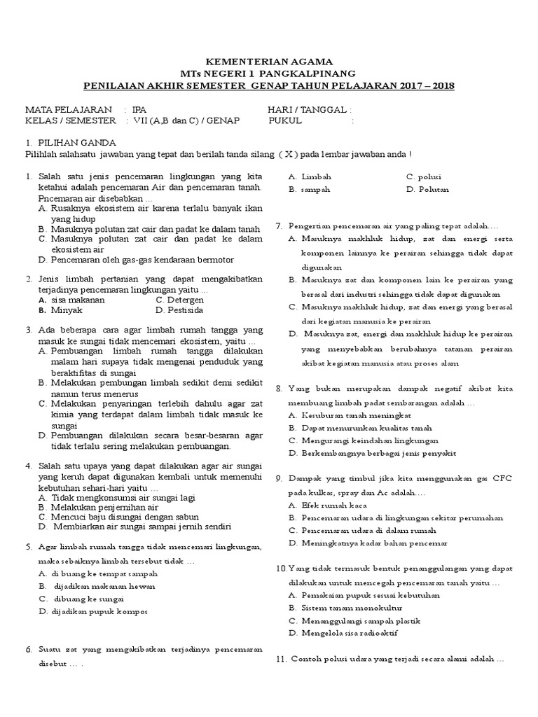 Soal Pencemaran Lingkungan Kelas 7 - fasrup