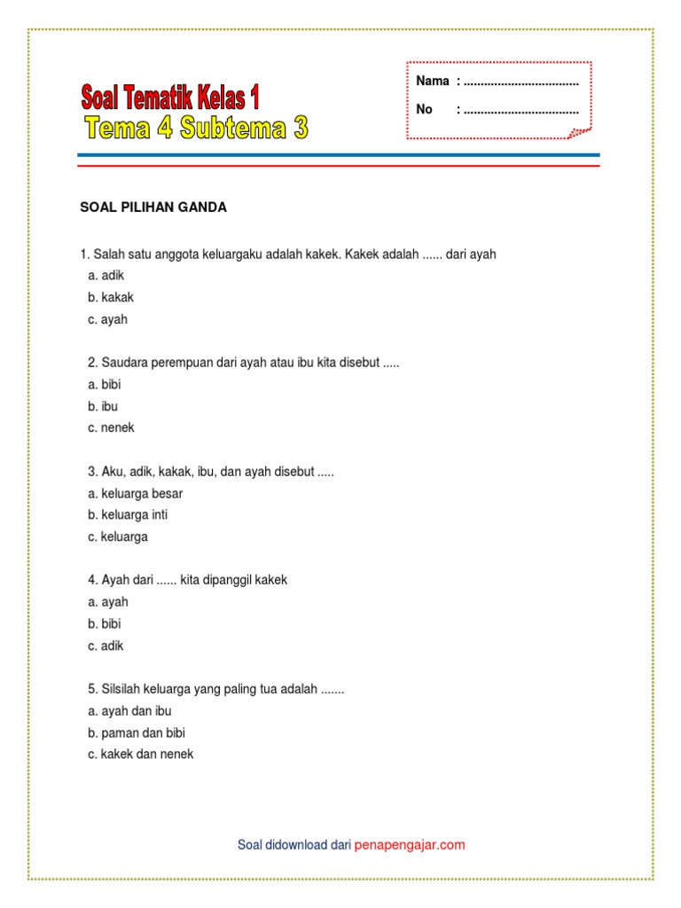 Download Soal Tematik Kelas 1 Tema 4 Subtema 1 Anggota Keluargaku …