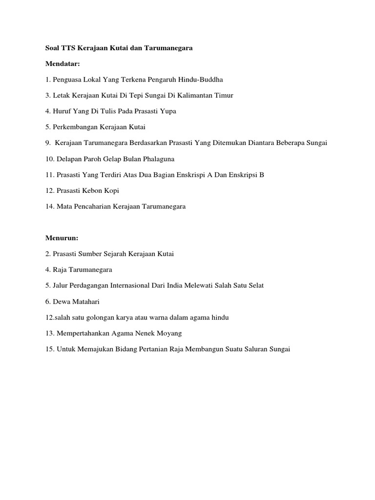 Soal TTS Kerajaan Kutai dan Tarumanegara
