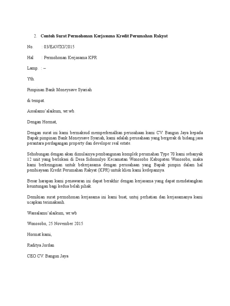 Contoh Surat Permohonan Kerjasama Kredit Perumahan Rakyat