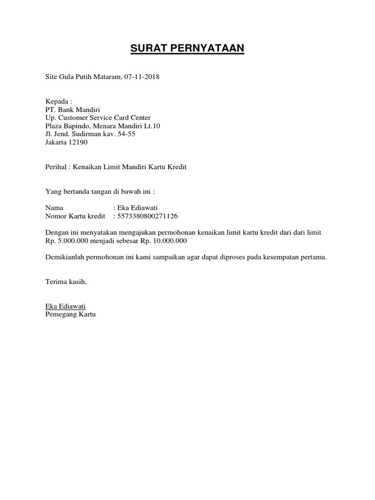 Contoh Surat Pernyataan Kenaikan Limit Kartu Kredit Mandiri …
