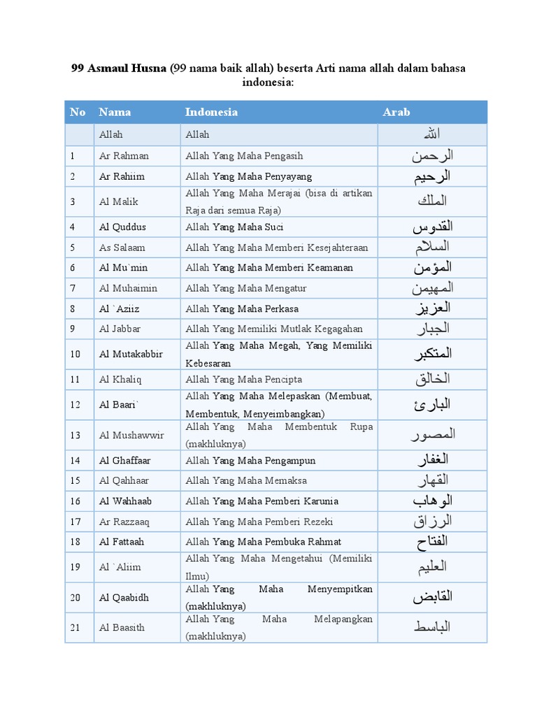 DOC) TABEL ASMAUL HUSNA DAN ARTINYA | Penulis Cilik - Academia.edu