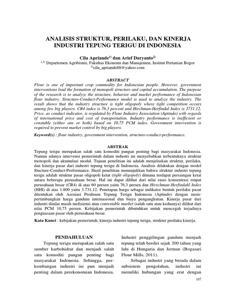 ANALISIS STRUKTUR, PERILAKU, DAN KINERJA INDUSTRI TEPUNG TERIGU DI INDONESIA | Forum Agribisnis : Agribusiness Forum