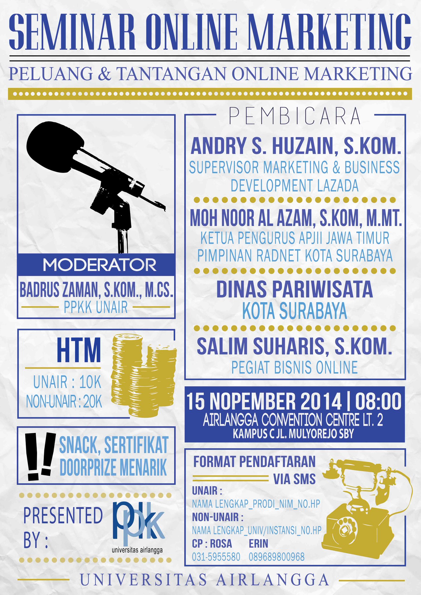 Event Surabaya on Twitter: “Seminar Online Marketing @ppkk_unair | 15 Nov ‘14 at UACC Lt. 2 | HTM Unair 10rb, NonUnair 20rb | Erin (089689800968) http://t.co/lI6G7jRuS3”