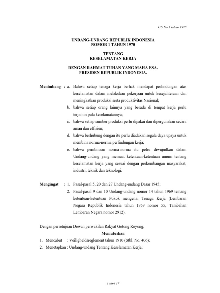 Uud No 1 Tahun 1970 Tentang Keselamatan Kerja - Info Seputar Kerjaan