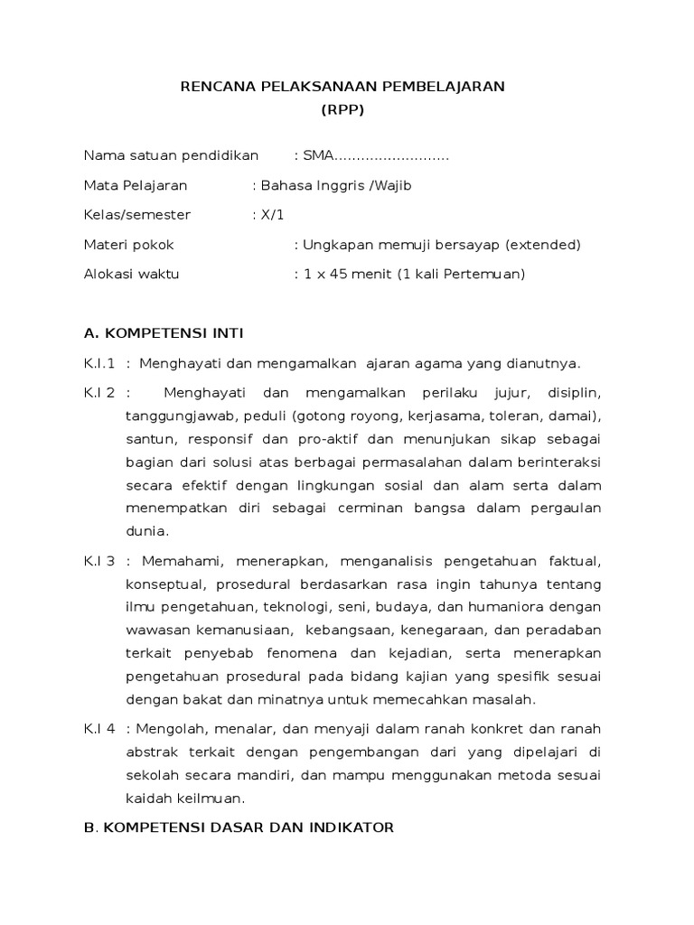 RPP BAHASA INGGRIS MEMUJI BERSAYAP KELAS X KURIKULUM 2013