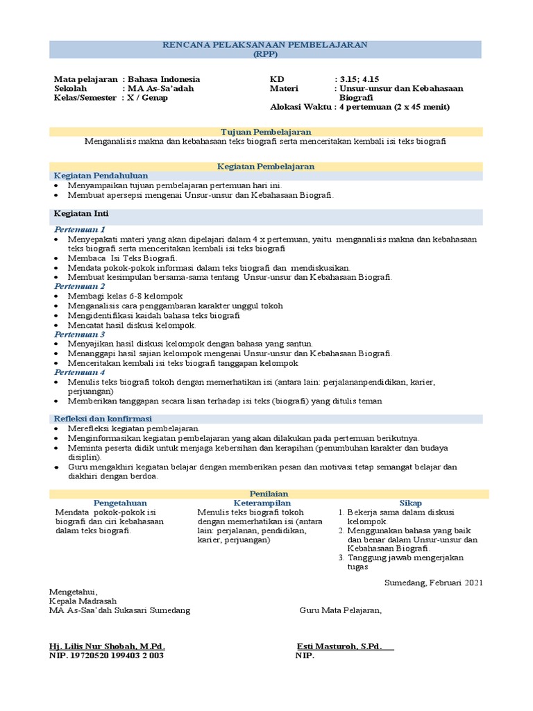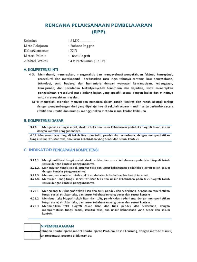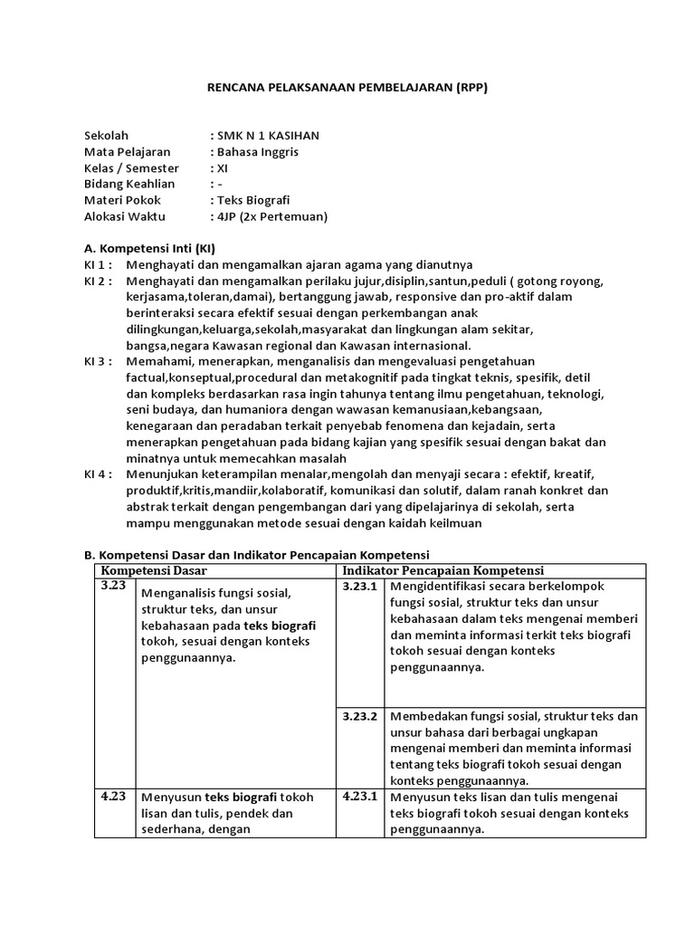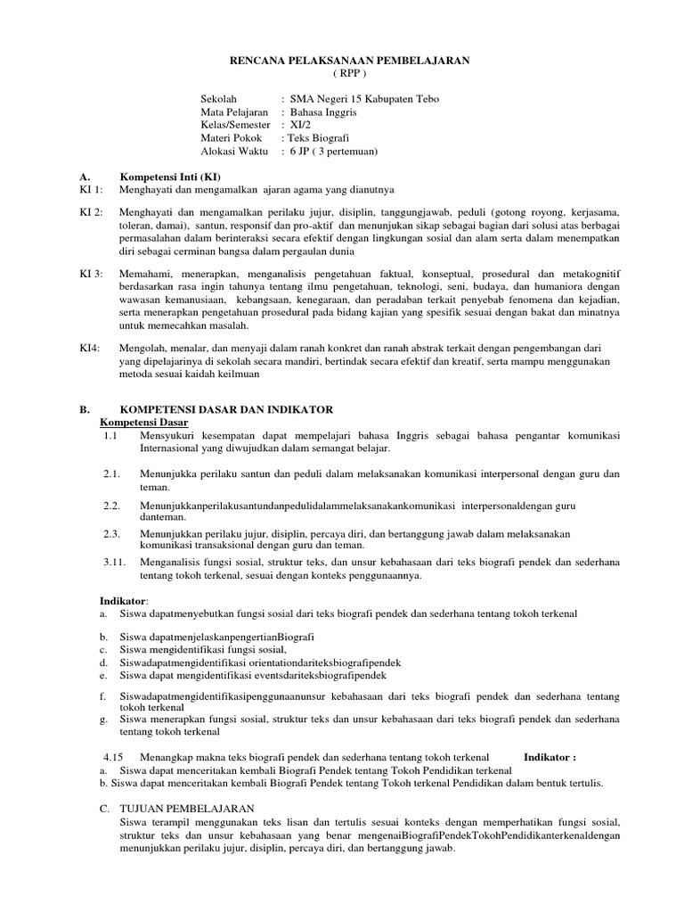 15. RPP KD 3.15 DAN 4.15 Unsur-unsur dan Kebahasaan Biografi …