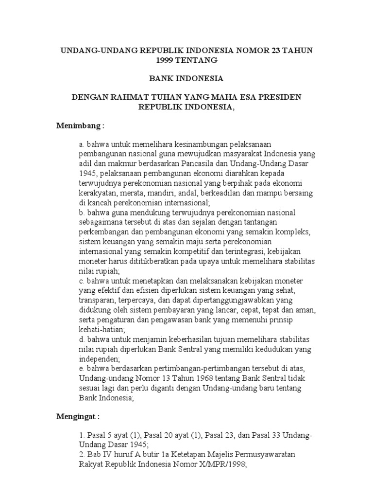 Uu nomor 23 tahun 1999 tentang bank indonesia
