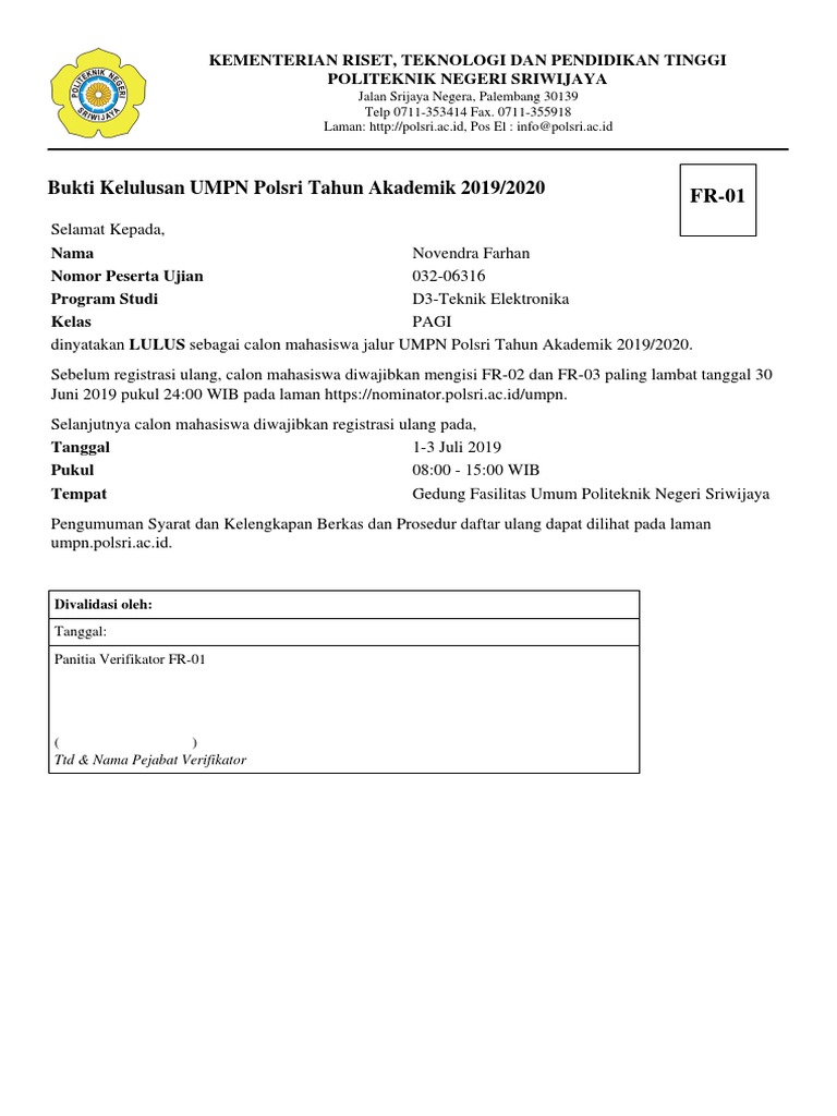 Bukti Kelulusan UMPN Polsri Tahun Akademik 2019/2020