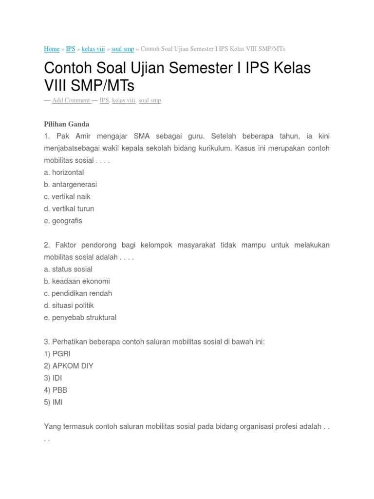 Contoh Soal Ujian Semester I IPS Kelas VIII SMP/MTs